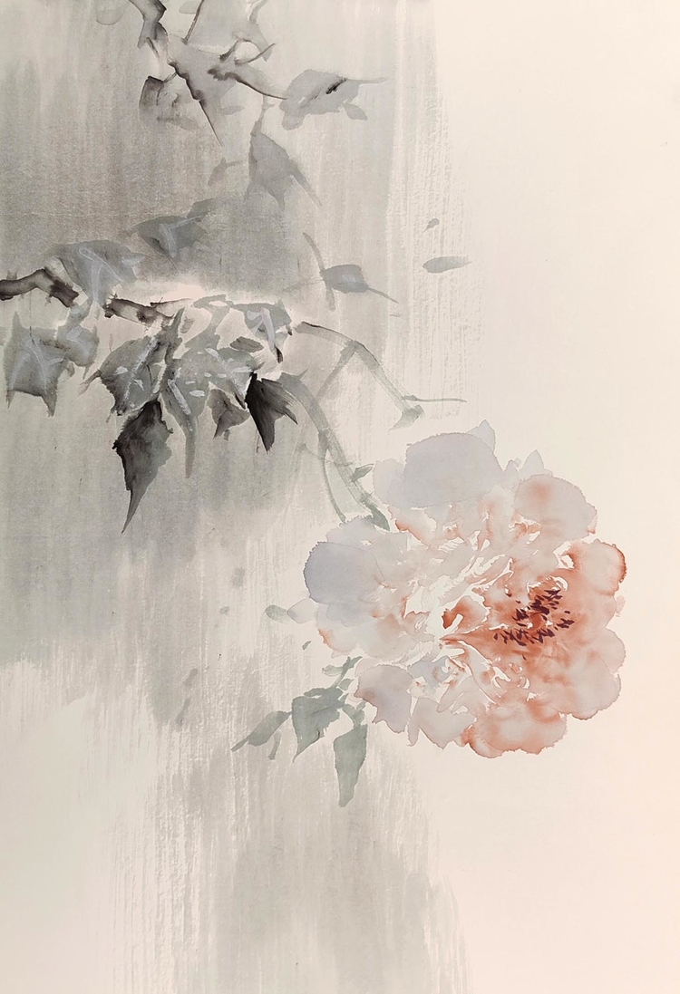 5.在25年的写生时,观察面前的牡丹在树影斑驳的光晕下呈现一种特殊的光感美,但在纸上很难去表现,直到写生快结束时才试验出光斑处大胆留白的方法来表现光感,效果还不错,这种表现手法历史上并没有,但个人觉得,只要能表现牡丹的美,任何方法都应该大胆尝试。