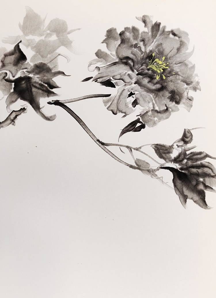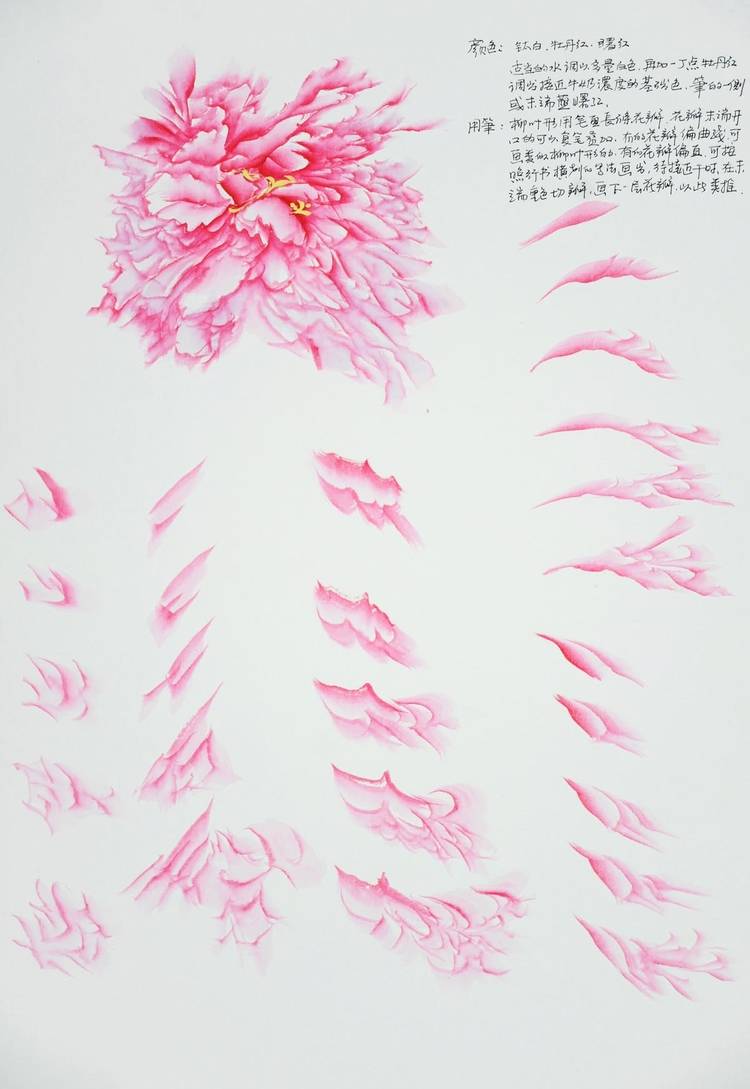 9.为了表现不同品种花瓣的不同特点,用笔方法也应该有所调整,在写生中,针对不同花瓣,散锋适合画花瓣零碎的牡丹、扁锋适合画绣球型那种繁密花瓣的牡丹,对于花瓣大小穿插比较丰富的,适合行草书的笔法。